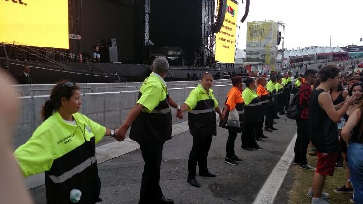 Próximo ao palco, funcionários da organização fizeram um cordão de isolamento, dando as mãos, para evitar que o público se aproximasse.